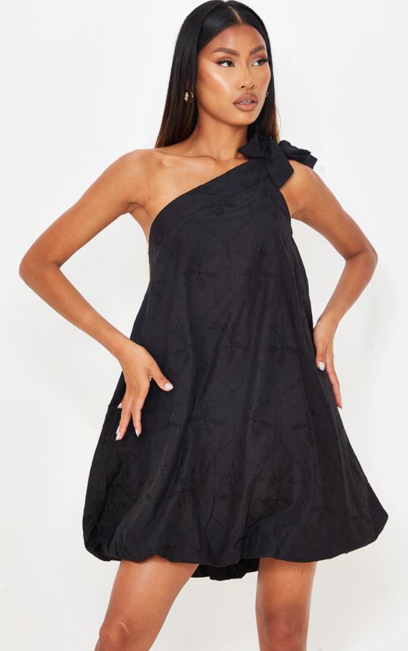 Besides, the tie design on this one-shoulder option looks very cute and festive. My favorite design feature in this dress is a black broderie anglaise material. And if you’re a normal person who doesn’t know what that means, it’s a whitework needlework technique that pierces round or oval holes through the fabric for an intriguing embroidery.