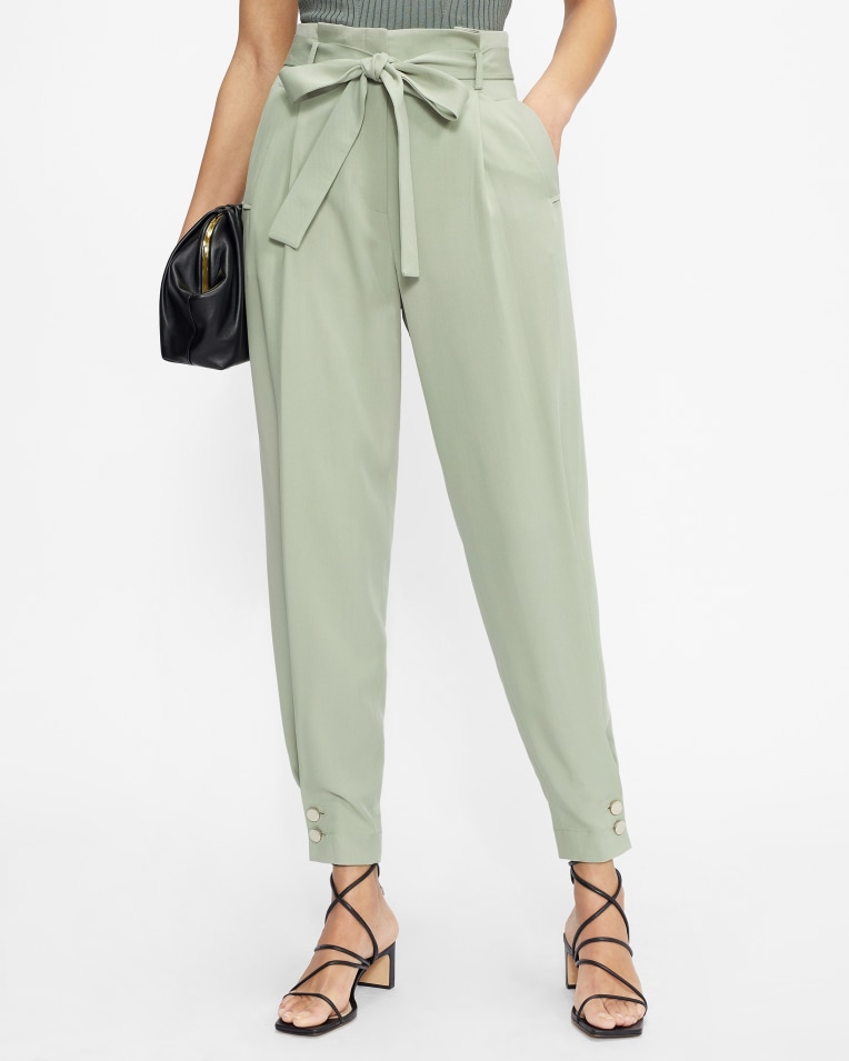 These pants come in a pale green color, which will be a perfect match for your creative blouse and you’d be keeping it consistently Ted Baker. A pair of buttons at the cuffs makes these pants visually attractive and innovative. They will look appropriate in many settings, from a literary society to a nightclub (reminder: we’re still in a pandemic).