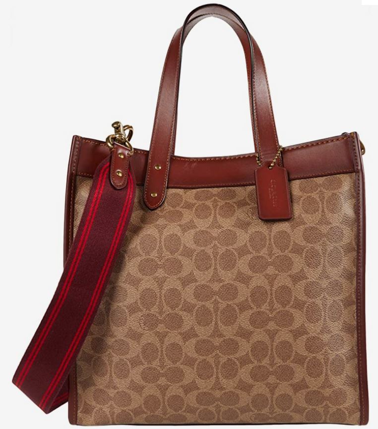 This tote bag is made of Coach’s signature coated canvas, which means that woven canvas material was coated in wax or resin to make it waterproof. It showcases the jacquard “C” pattern rimmed in cognac-colored leather. There is also a red-brown strap included, which you can choose to attach. And I think you should because it’s a great artistic addition to this bag.