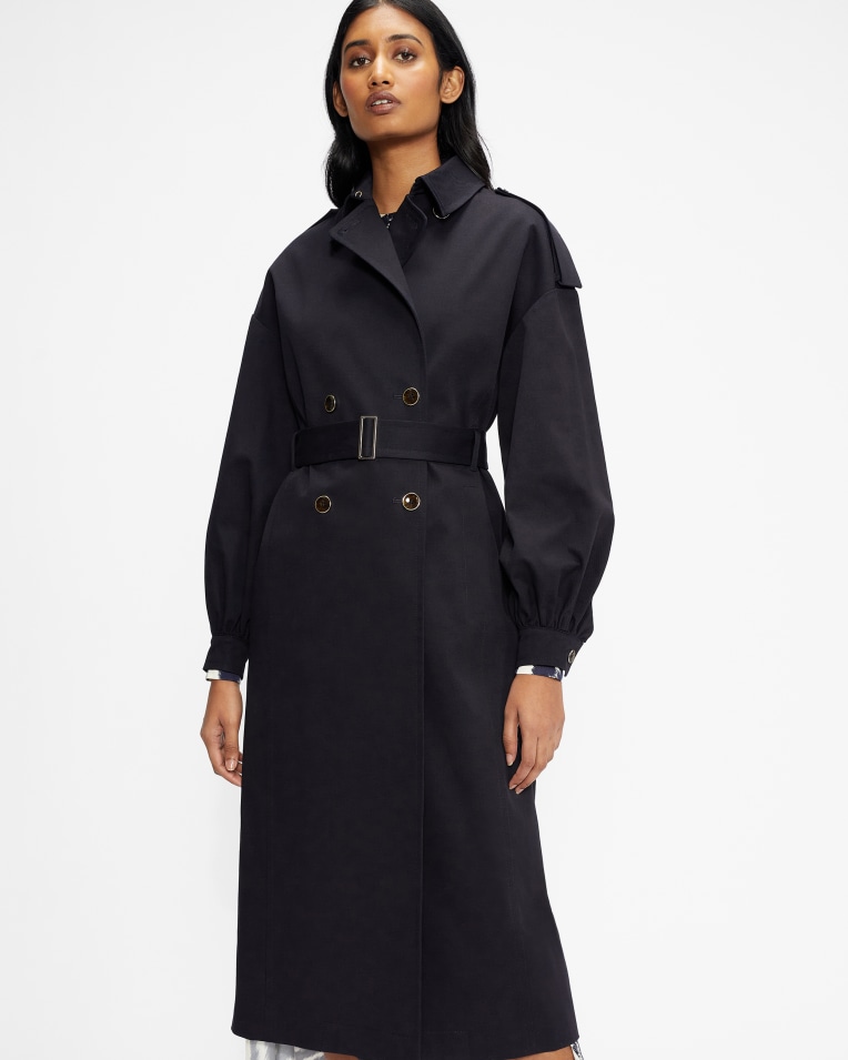 This trench coat has dropped shoulders and balloon sleeves that create a relaxed yet striking silhouette.