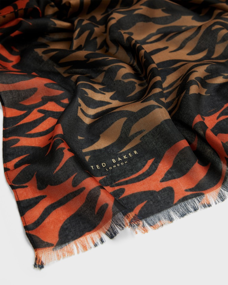 This one has an interesting print that looks like an animal print or a school of fish; I can’t make up my mind. But I know this: a light brown color in the middle of the scarf will match the bag, and the orange frame will bring some fall feel to the look.