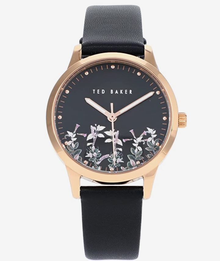 But the story doesn’t end with the floral earrings. The bumblebee needs to fly down to pollinate a bed of flowers painted on the face of the Ted Baker watch!
