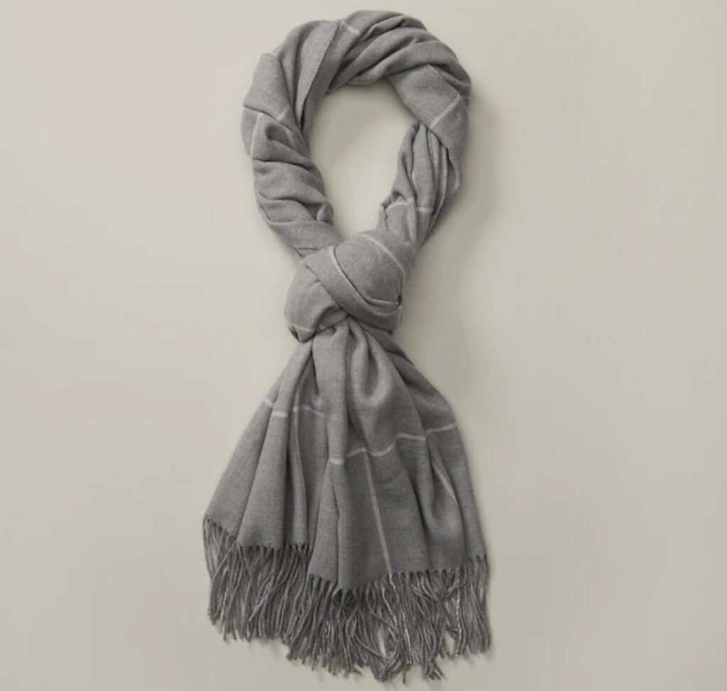 Depending on the weather, you may need to bundle up even more. Consider this soft and cozy scarf in grey. The gingham-print can be styled as a shawl.