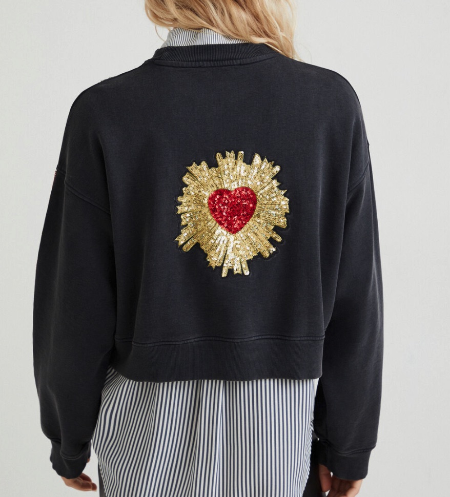 There is an artistic gemstone embellishment of a reaching hand, placed on the shoulder of the sweater, and a big heart with golden rays of sequins on the back. That will definitely make you attract companionship and light up the room!