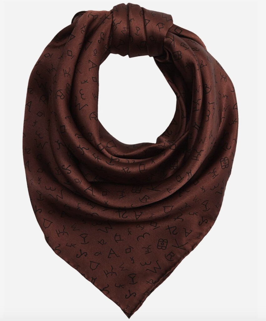 This brown bandana scarf has a silky, luxurious feel. The symbols depicted all over it will add an even more mysterious flare to your look.