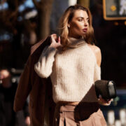 For a more relaxed look, pair your black sweater with blue jeans and to make the look pop, you could even go for cowgirl boots. That’s what Snejana did in the Instagram post above. She’s keeping skinny jeans in style, and her boots stand out due to their cognac color and fringe detailing. Plus, Snejana is perched on a park railing, posing in supermodel sunglasses while snacking on a McDonald’s French fry… and isn’t that just the ultimate lifestyle flex?