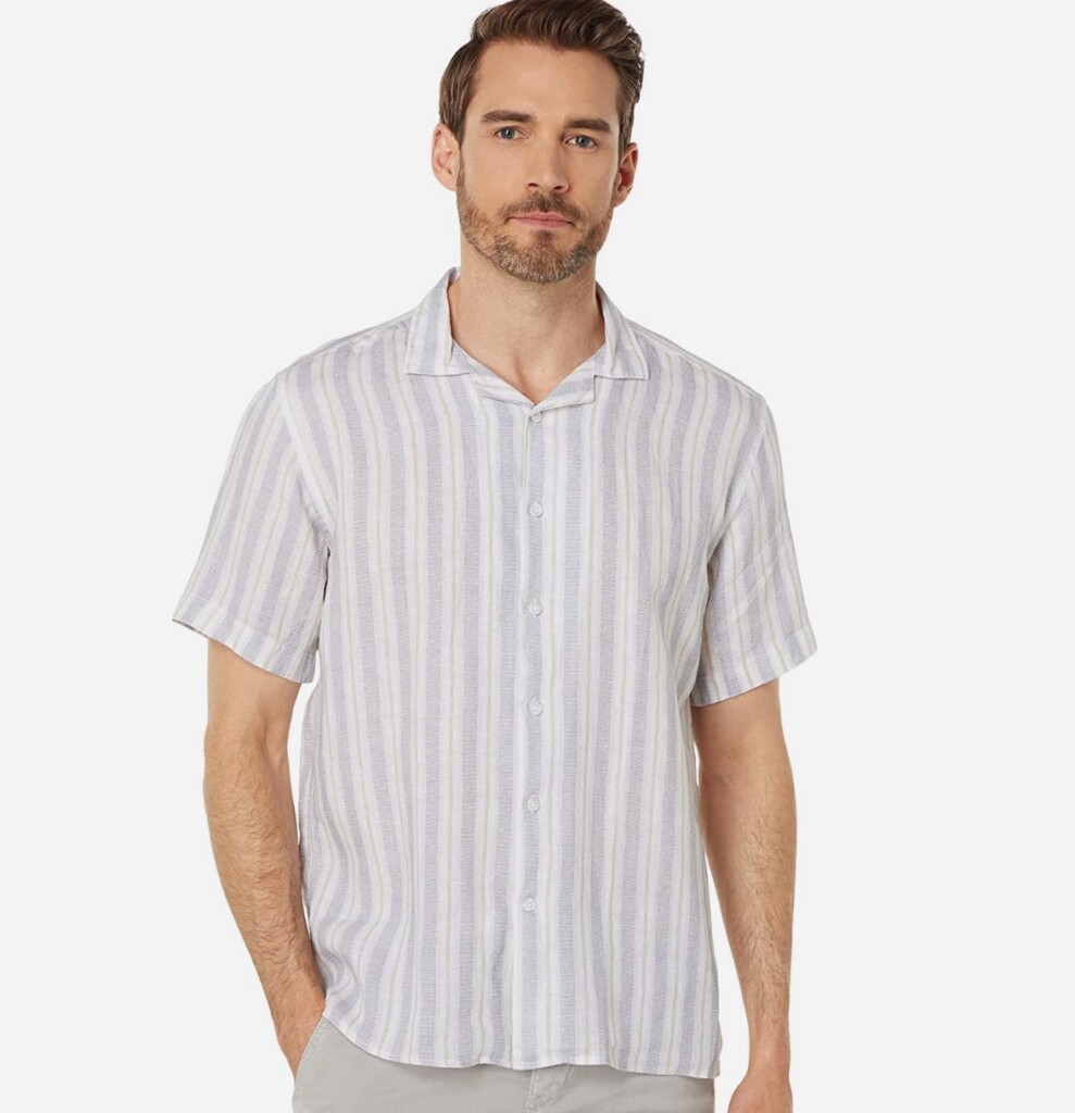 What do you think? Yes, the vertical stipes are the ultimate hack for appearing taller because they draw the eyes up. So, the shirt above will do that, but in a very relaxed way.