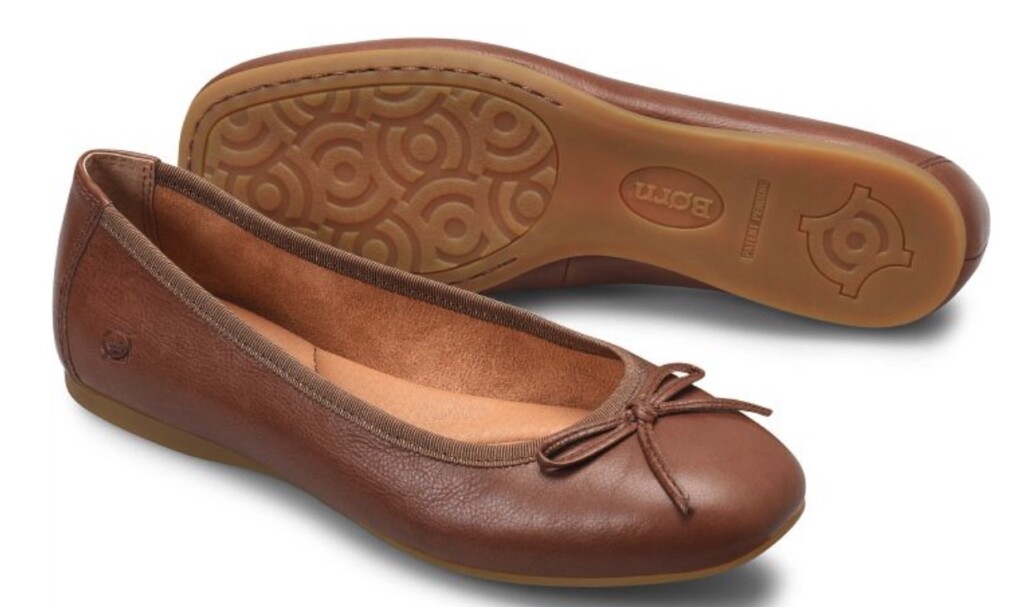 Born, a shoe company located in Greenwich, Connecticut, has sophisticated ballerinas with a bow.
