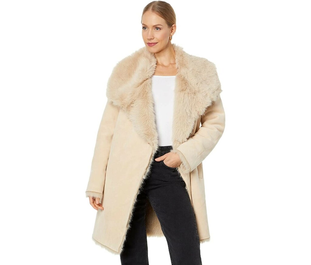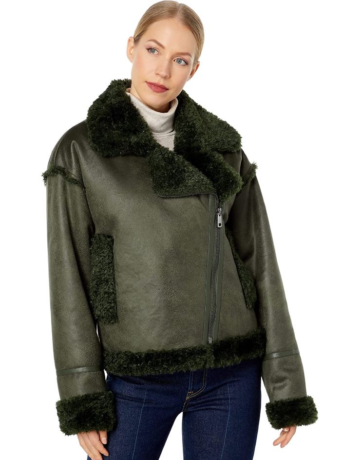 The jacket above has similar aesthetics but comes in a darker color – a rich olive hue. In addition to the faux fur shawl collar and cuffs, it has faux fur in the pockets and hemline.