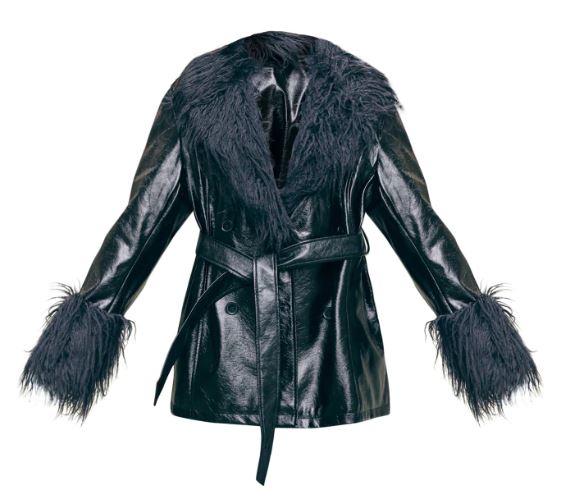 If you prefer something longer and shinier, a black vinyl coat with a faux fur trim is the way to go.