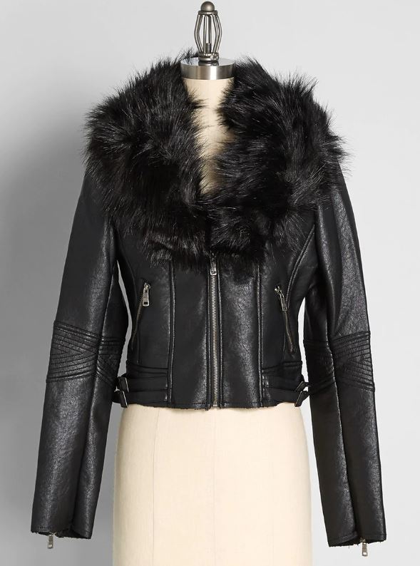 If you are looking for a similar option, check out this short black coat, which contains both vegan leather and a removable faux-fur collar for the environmentally-concerned: