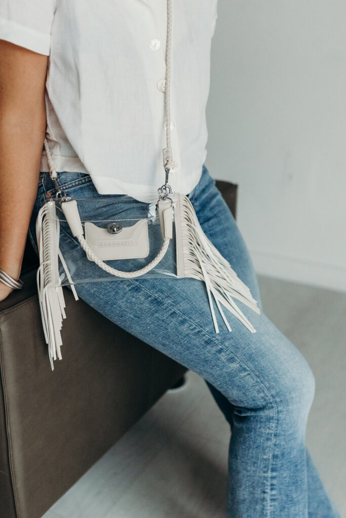I style our clear handbags with almost every outfit. The benefit of having the bag be a majority clear, you’re flexible with clothing and shoe colors. The colors that are on the bags are neutral and pretty much go with anything! My favorite way to style the bag is through what’s in the bag. We often know the contents that we put in our purses, but never really get to show off our cute wallet, sunglasses case or lipstick. It’s a fun way to showcase your personality! Again, these bags can be dressed up or down, my favorite go to is a pair of jeans with a button down or a casual dress.